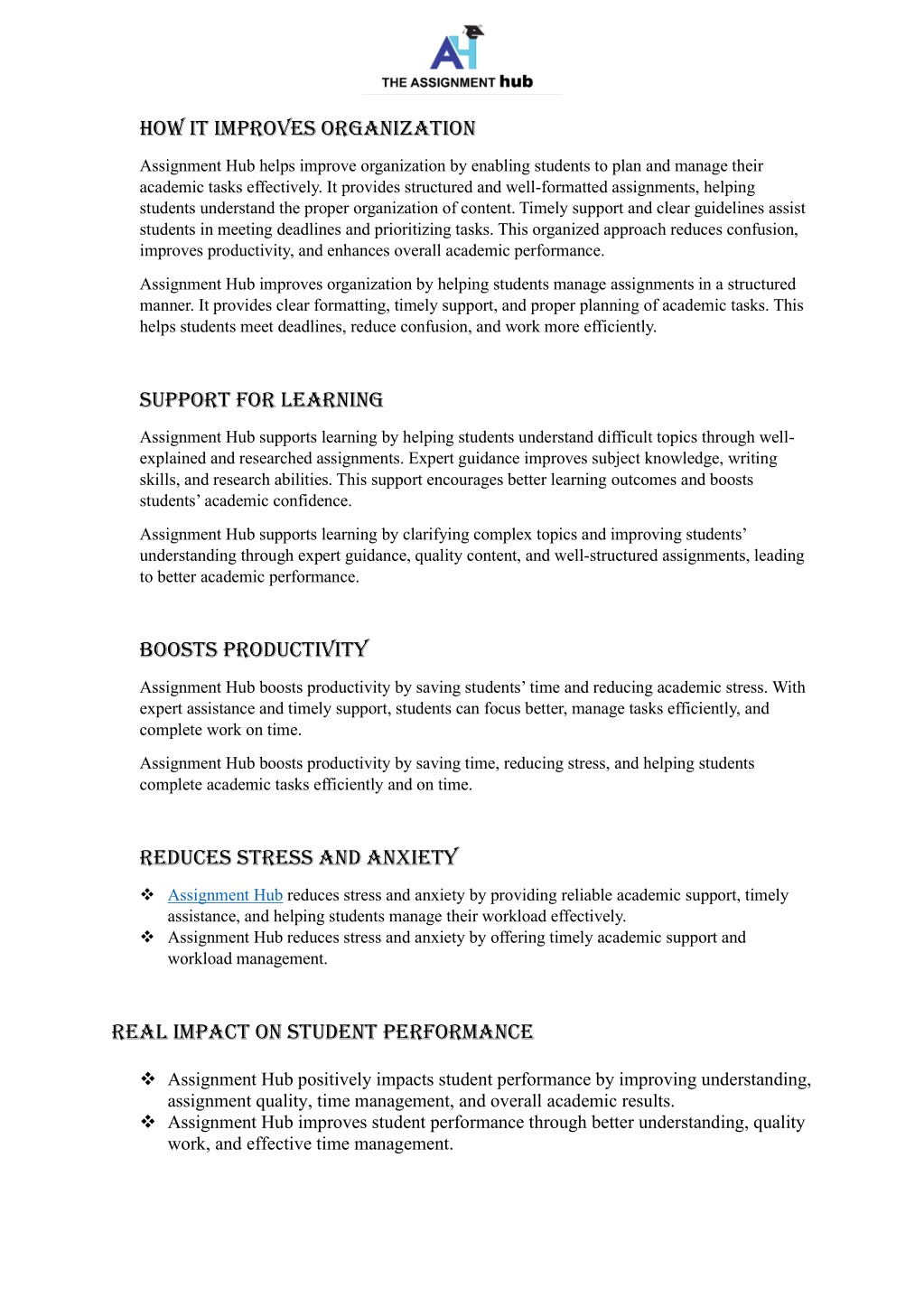 how iT improves orgAnizATion Assignment Hub helps improve organization by enabling students to plan and manage their academic tasks effectively. It provides structured and well-formatted assignments, helping students understand the proper organization of content. Timely support and clear guidelines assist students in meeting deadlines and prioritizing tasks. This organized approach reduces confusion, improves productivity, and enhances overall academic performance. Assignment Hub improves organization by helping students manage assignments in a structured manner. It provides clear formatting, timely support, and proper planning of academic tasks. This helps students meet deadlines, reduce confusion, and work more efficiently. supporT For leArning Assignment Hub supports learning by helping students understand difficult topics through well- explained and researched assignments. Expert guidance improves subject knowledge, writing skills, and research abilities. This support encourages better learning outcomes and boosts students’ academic confidence. Assignment Hub supports learning by clarifying complex topics and improving students’ understanding through expert guidance, quality content, and well-structured assignments, leading to better academic performance. boosTs producTiviTy Assignment Hub boosts productivity by saving students’ time and reducing academic stress. With expert assistance and timely support, students can focus better, manage tasks efficiently, and complete work on time. Assignment Hub boosts productivity by saving time, reducing stress, and helping students complete academic tasks efficiently and on time. reduces sTress And AnxieTy ❖Assignment Hub reduces stress and anxiety by providing reliable academic support, timely assistance, and helping students manage their workload effectively. ❖Assignment Hub reduces stress and anxiety by offering timely academic support and workload management. reAl impAcT on sTudenT perFormAnce ❖Assignment Hub positively impacts student performance by improving understanding, assignment quality, time management, and overall academic results. ❖Assignment Hub improves student performance through better understanding, quality work, and effective time management.
