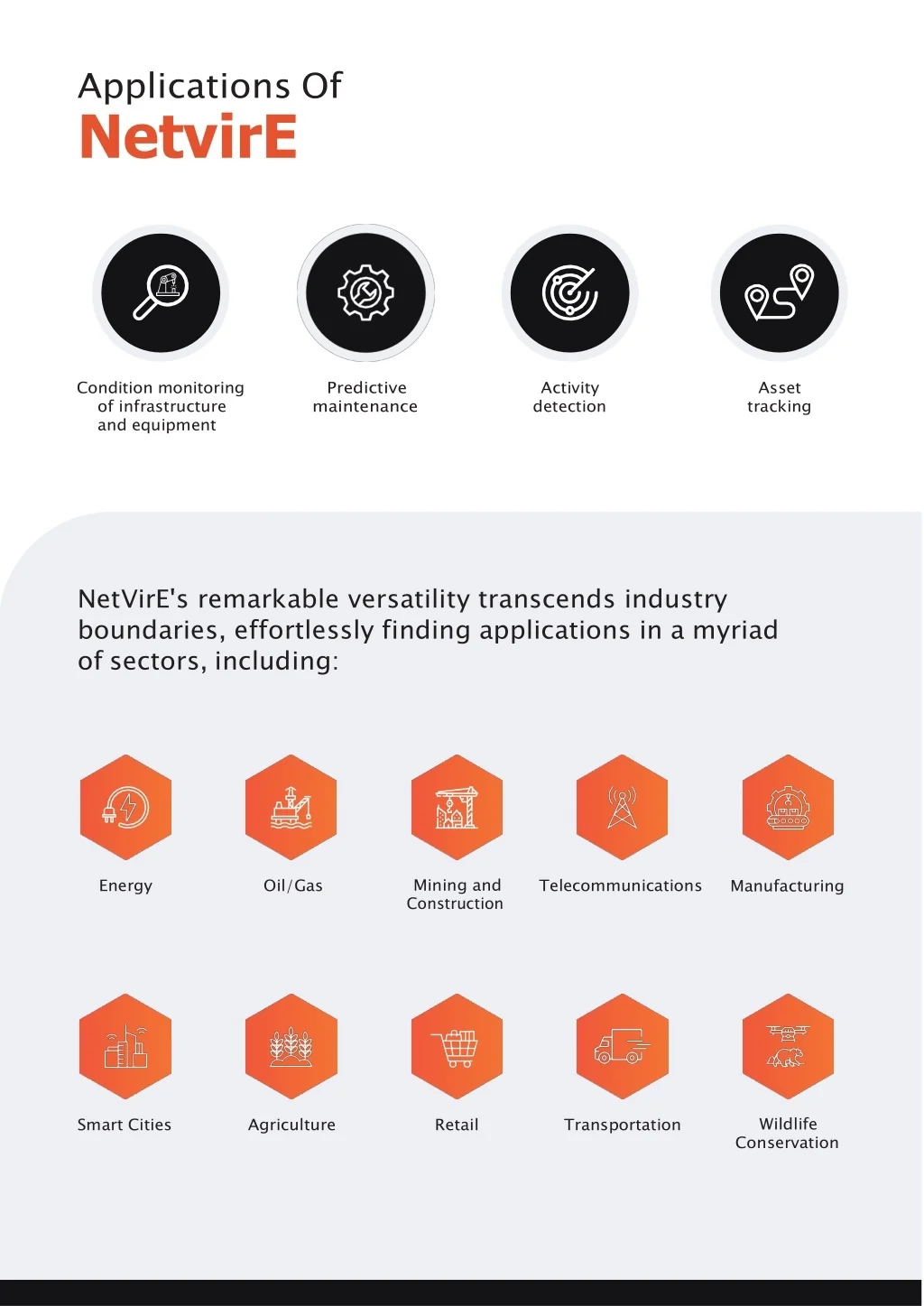 Applications Of NetvirE Condition monitoring of infrastructure and equipment Predictive maintenance Activity detection Asset tracking NetVirE's remarkable versatility transcends industry boundaries, effortlessly finding applications in a myriad of sectors, including: Mining and Construction Energy Oil/Gas Telecommunications Manufacturing Wildlife Conservation Smart Cities Agriculture Retail Transportation