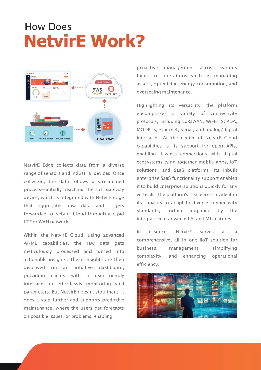 How Does NetvirE Work? proactive management across various facets of operations such as managing assets, optimizing energy consumption, and overseeing maintenance. Highlighting its versatility, the platform encompasses a variety of connectivity protocols, including LoRaWAN, Wi-Fi, SCADA, MODBUS, Ethernet, Serial, and analog/digital interfaces. At the center of NetvirE Cloud capabilities is its support for open APIs, enabling flawless connections with digital ecosystems tying together mobile apps, IoT solutions, and SaaS platforms. Its inbuilt enterprise SaaS functionality support enables it to build Enterprise solutions quickly for any verticals. The platform's resilience is evident in its capacity to adapt to diverse connectivity standards, integration of advanced AI and ML features. NetvirE Edge collects data from a diverse range of sensors and industrial devices. Once collected, the data follows a streamlined process—initially reaching the IoT gateway device, which is integrated with NetvirE edge that aggregates raw data and gets forwarded to NetvirE Cloud through a rapid LTE or WAN network. further amplified by the In comprehensive, all-in-one IIoT solution for business complexity, efficiency. essence, NetvirE serves as a Within the NetvirE Cloud, using advanced AI/ML capabilities, the raw data gets meticulously processed and turned into actionable insights. These insights are then displayed providing interface for effortlessly monitoring vital parameters. But NetvirE doesn't stop there, it goes a step further and supports predictive maintenance, where the users get forecasts on possible issues, or problems, enabling management, and simplifying operational enhancing on clients an intuitive with dashboard, user-friendly a