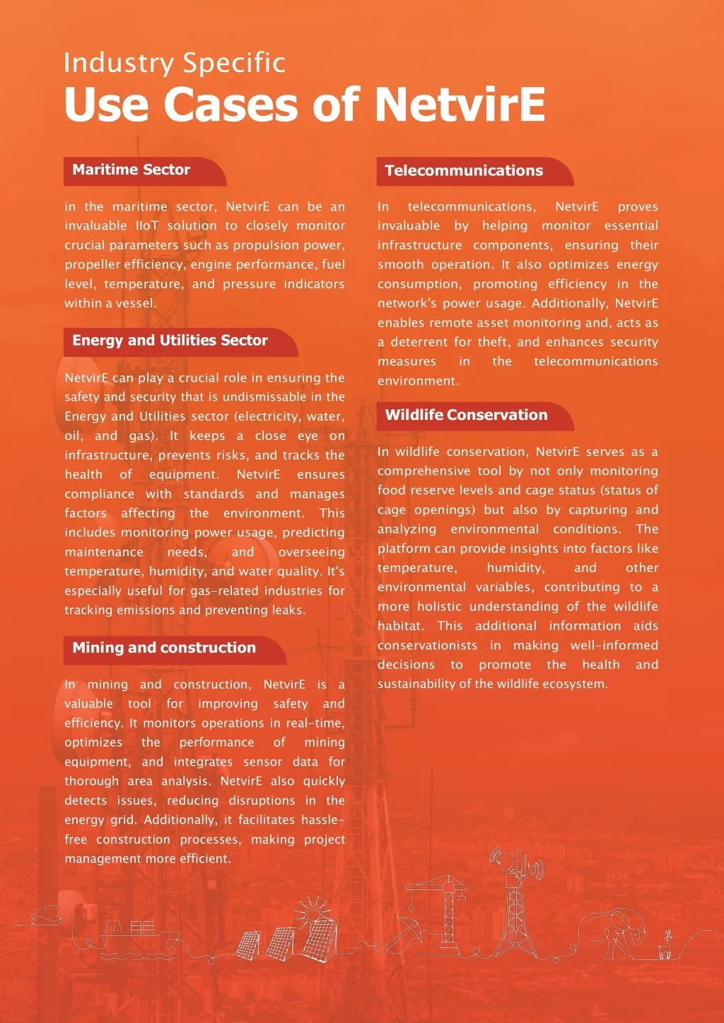 Industry Specific Use Cases of NetvirE Maritime Sector Telecommunications in the maritime sector, NetvirE can be an invaluable IIoT solution to closely monitor crucial parameters such as propulsion power, propeller efficiency, engine performance, fuel level, temperature, and pressure indicators within a vessel. In invaluable by helping monitor essential infrastructure components, ensuring their smooth operation. It also optimizes energy consumption, promoting efficiency in the network's power usage. Additionally, NetvirE enables remote asset monitoring and, acts as a deterrent for theft, and enhances security measures environment. telecommunications, NetvirE proves Energy and Utilities Sector in the telecommunications NetvirE can play a crucial role in ensuring the safety and security that is undismissable in the Energy and Utilities sector (electricity, water, oil, and gas). It keeps a close eye on infrastructure, prevents risks, and tracks the health compliance with standards and manages factors affecting the environment. This includes monitoring power usage, predicting maintenance temperature, humidity, and water quality. It's especially useful for gas-related industries for tracking emissions and preventing leaks. Wildlife Conservation In wildlife conservation, NetvirE serves as a comprehensive tool by not only monitoring food reserve levels and cage status (status of cage openings) but also by capturing and analyzing environmental conditions. The platform can provide insights into factors like temperature, environmental variables, contributing to a more holistic understanding of the wildlife habitat. This additional information aids conservationists in making well-informed decisions to promote the health and sustainability of the wildlife ecosystem. of equipment. NetvirE ensures needs, and overseeing humidity, and other Mining and construction In mining and construction, NetvirE is a valuable tool for improving safety and efficiency. It monitors operations in real-time, optimizes equipment, and integrates sensor data for thorough area analysis. NetvirE also quickly detects issues, reducing disruptions in the energy grid. Additionally, it facilitates hassle- free construction processes, making project management more efficient. the performance of mining