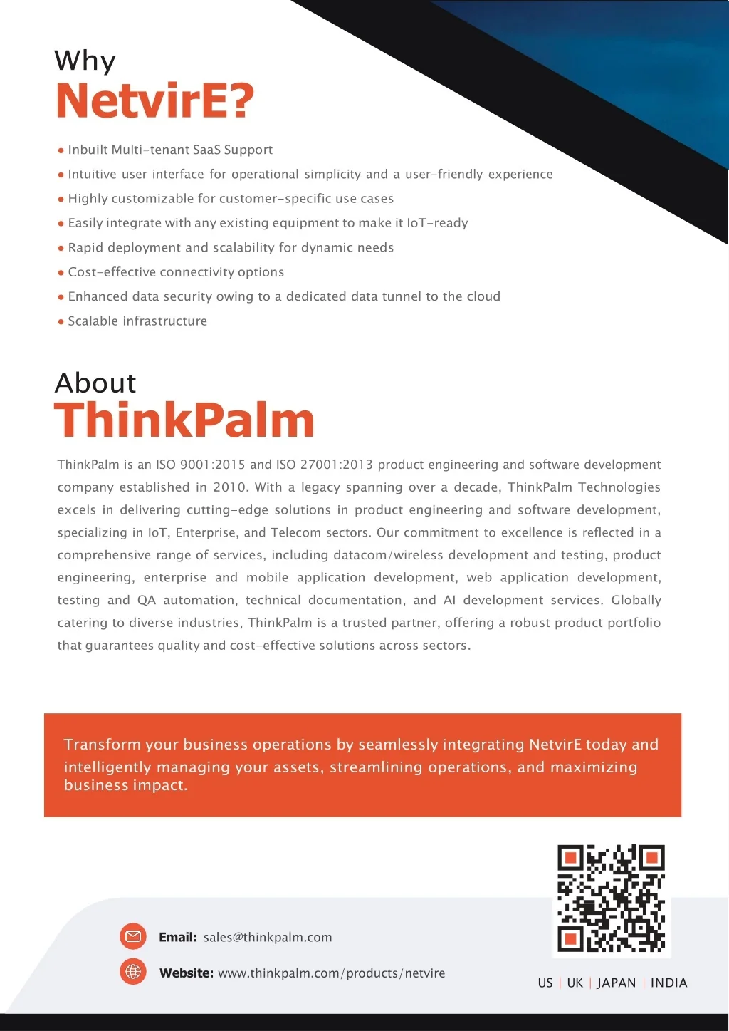 Why NetvirE? ●Inbuilt Multi-tenant SaaS Support ●Intuitive user interface for operational simplicity and a user-friendly experience ●Highly customizable for customer-specific use cases ●Easily integrate with any existing equipment to make it IoT-ready ●Rapid deployment and scalability for dynamic needs ●Cost-effective connectivity options ●Enhanced data security owing to a dedicated data tunnel to the cloud ●Scalable infrastructure About ThinkPalm ThinkPalm is an ISO 9001:2015 and ISO 27001:2013 product engineering and software development company established in 2010. With a legacy spanning over a decade, ThinkPalm Technologies excels in delivering cutting-edge solutions in product engineering and software development, specializing in IoT, Enterprise, and Telecom sectors. Our commitment to excellence is reflected in a comprehensive range of services, including datacom/wireless development and testing, product engineering, enterprise and mobile application development, web application development, testing and QA automation, technical documentation, and AI development services. Globally catering to diverse industries, ThinkPalm is a trusted partner, offering a robust product portfolio that guarantees quality and cost-effective solutions across sectors. Transform your business operations by seamlessly integrating NetvirE today and intelligently managing your assets, streamlining operations, and maximizing business impact. Email: sales@thinkpalm.com Website: www.thinkpalm.com/products/netvire US | UK | JAPAN | INDIA