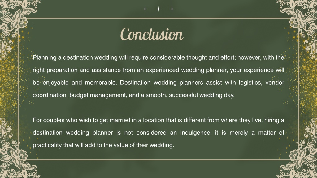10. Conclusion Planning a destination wedding will require considerable thought and effort; however, with the right preparation and assistance from an experienced wedding planner, your experience will be enjoyable and memorable. Destination wedding planners assist with logistics, vendor coordination, budget management, and a smooth, successful wedding day. For couples who wish to get married in a location that is different from where they live, hiring a destination wedding planner is not considered an indulgence; it is merely a matter of practicality that will add to the value of their wedding.