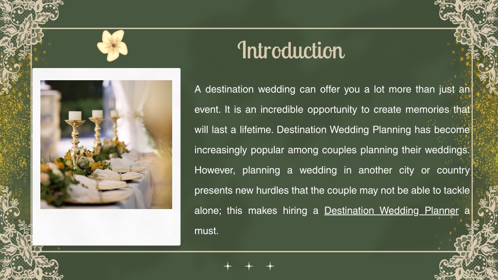 2. Introduction A destination wedding can offer you a lot more than just an event. It is an incredible opportunity to create memories that will last a lifetime. Destination Wedding Planning has become increasingly popular among couples planning their weddings. However, planning a wedding in another city or country presents new hurdles that the couple may not be able to tackle alone; this makes hiring a Destination Wedding Planner a must.