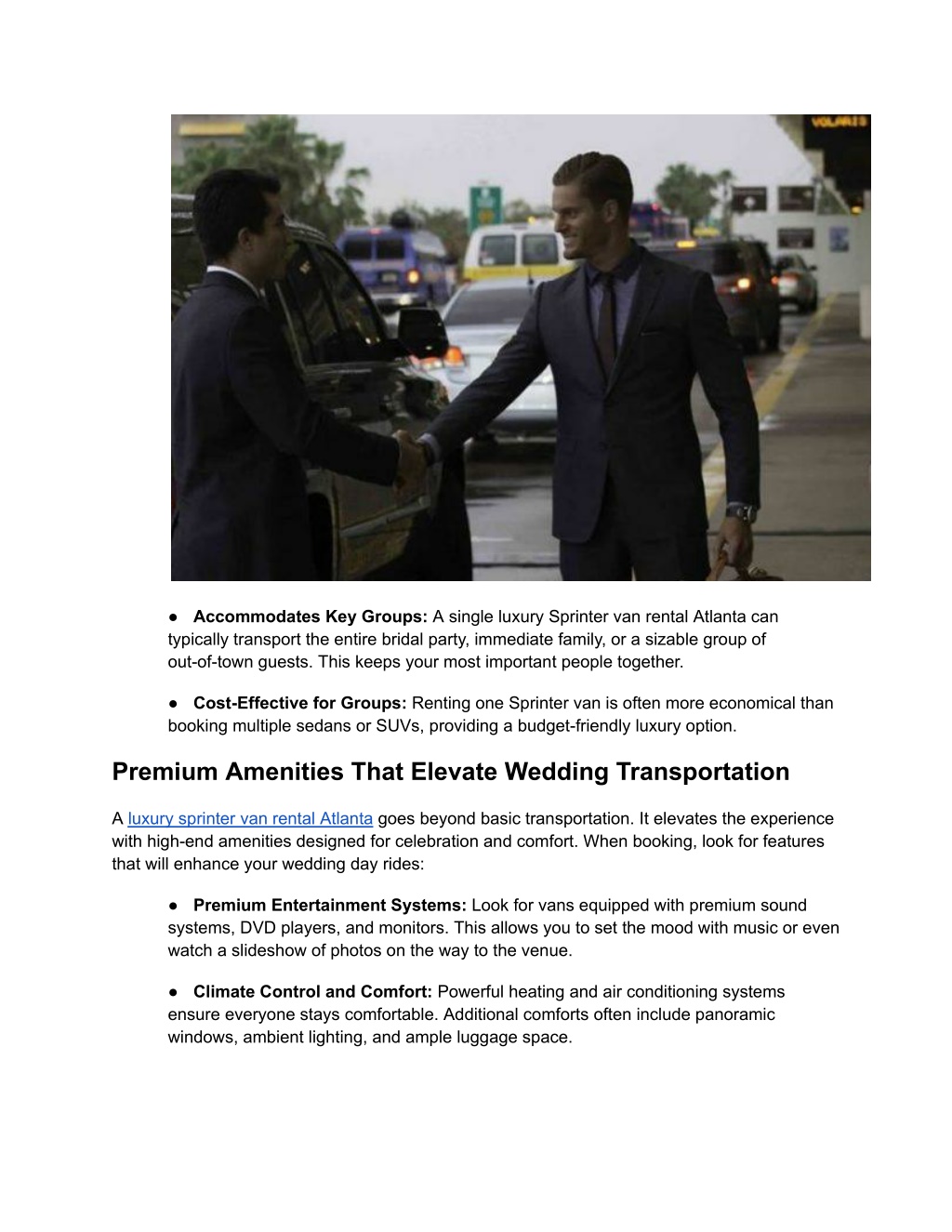 3. ●Accommodates Key Groups: A single luxury Sprinter van rental Atlanta can typically transport the entire bridal party, immediate family, or a sizable group of out-of-town guests. This keeps your most important people together. ●Cost-Effective for Groups: Renting one Sprinter van is often more economical than booking multiple sedans or SUVs, providing a budget-friendly luxury option. Premium Amenities That Elevate Wedding Transportation A luxury sprinter van rental Atlanta goes beyond basic transportation. It elevates the experience with high-end amenities designed for celebration and comfort. When booking, look for features that will enhance your wedding day rides: ●Premium Entertainment Systems: Look for vans equipped with premium sound systems, DVD players, and monitors. This allows you to set the mood with music or even watch a slideshow of photos on the way to the venue. ●Climate Control and Comfort: Powerful heating and air conditioning systems ensure everyone stays comfortable. Additional comforts often include panoramic windows, ambient lighting, and ample luggage space.