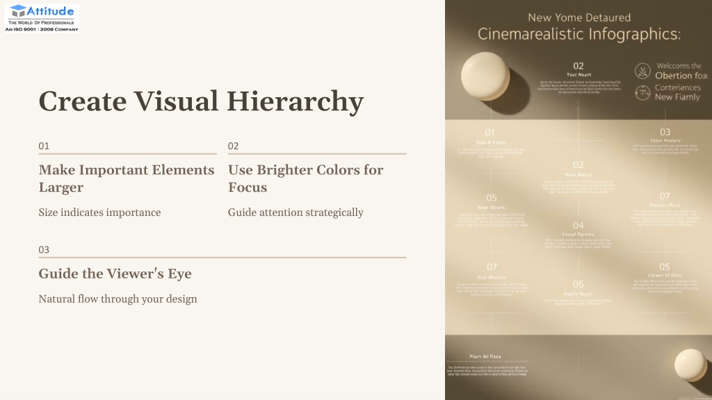 Create Visual Hierarchy 01 02 Make Important Elements Larger Use Brighter Colors for Focus Size indicates importance Guide attention strategically 03 Guide the Viewer's Eye Natural flow through your design