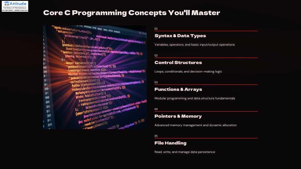 Core C Programming Concepts You'll Master 01 Syntax & Data Types Variables, operators, and basic input/output operations 02 Control Structures Loops, conditionals, and decision-making logic 03 Functions & Arrays Modular programming and data structure fundamentals 04 Pointers & Memory Advanced memory management and dynamic allocation 05 File Handling Read, write, and manage data persistence preencoded.png