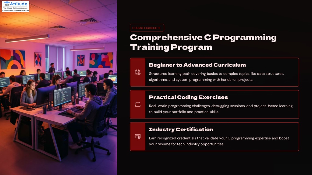 COURSE HIGHLIGHTS Comprehensive C Programming Training Program Beginner to Advanced Curriculum Structured learning path covering basics to complex topics like data structures, algorithms, and system programming with hands-on projects. Practical Coding Exercises Real-world programming challenges, debugging sessions, and project-based learning to build your portfolio and practical skills. Industry Certification Earn recognized credentials that validate your C programming expertise and boost your resume for tech industry opportunities. preencoded.png