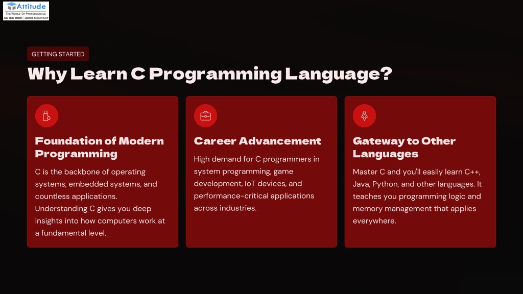 GETTING STARTED Why Learn C Programming Language? Foundation of Modern Programming Career Advancement Gateway to Other Languages High demand for C programmers in system programming, game development, IoT devices, and performance-critical applications across industries. C is the backbone of operating systems, embedded systems, and countless applications. Understanding C gives you deep insights into how computers work at a fundamental level. Master C and you'll easily learn C++, Java, Python, and other languages. It teaches you programming logic and memory management that applies everywhere. preencoded.png
