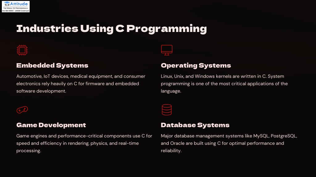 Industries Using C Programming Embedded Systems Operating Systems Automotive, IoT devices, medical equipment, and consumer electronics rely heavily on C for firmware and embedded software development. Linux, Unix, and Windows kernels are written in C. System programming is one of the most critical applications of the language. Game Development Database Systems Game engines and performance-critical components use C for speed and efficiency in rendering, physics, and real-time processing. Major database management systems like MySQL, PostgreSQL, and Oracle are built using C for optimal performance and reliability. preencoded.png