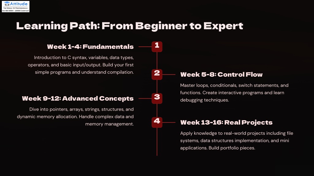 Learning Path: From Beginner to Expert 1 Week 1-4: Fundamentals Introduction to C syntax, variables, data types, operators, and basic input/output. Build your first simple programs and understand compilation. 2 Week 5-8: Control Flow Master loops, conditionals, switch statements, and functions. Create interactive programs and learn debugging techniques. 3 Week 9-12: Advanced Concepts Dive into pointers, arrays, strings, structures, and dynamic memory allocation. Handle complex data and 4 Week 13-16: Real Projects memory management. Apply knowledge to real-world projects including file systems, data structures implementation, and mini applications. Build portfolio pieces. preencoded.png