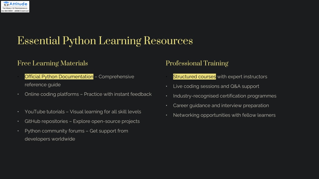Essential Python Learning Resources Free Learning Materials Professional Training • Official Python Documentation – Comprehensive reference guide • Structured courses with expert instructors • Live coding sessions and Q&A support • Online coding platforms – Practice with instant feedback • Industry-recognised certification programmes • Career guidance and interview preparation • YouTube tutorials – Visual learning for all skill levels • Networking opportunities with fellow learners • GitHub repositories – Explore open-source projects • Python community forums – Get support from developers worldwide preencoded.png