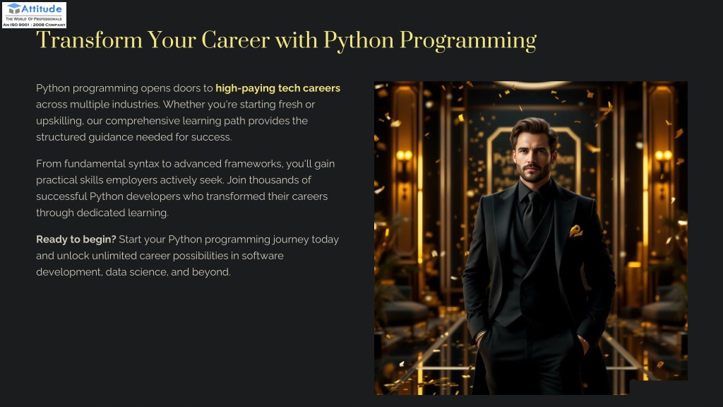 Transform Your Career with Python Programming Python programming opens doors to high-paying tech careers across multiple industries. Whether you're starting fresh or upskilling, our comprehensive learning path provides the structured guidance needed for success. From fundamental syntax to advanced frameworks, you'll gain practical skills employers actively seek. Join thousands of successful Python developers who transformed their careers through dedicated learning. Ready to begin? Start your Python programming journey today and unlock unlimited career possibilities in software development, data science, and beyond. preencoded.png