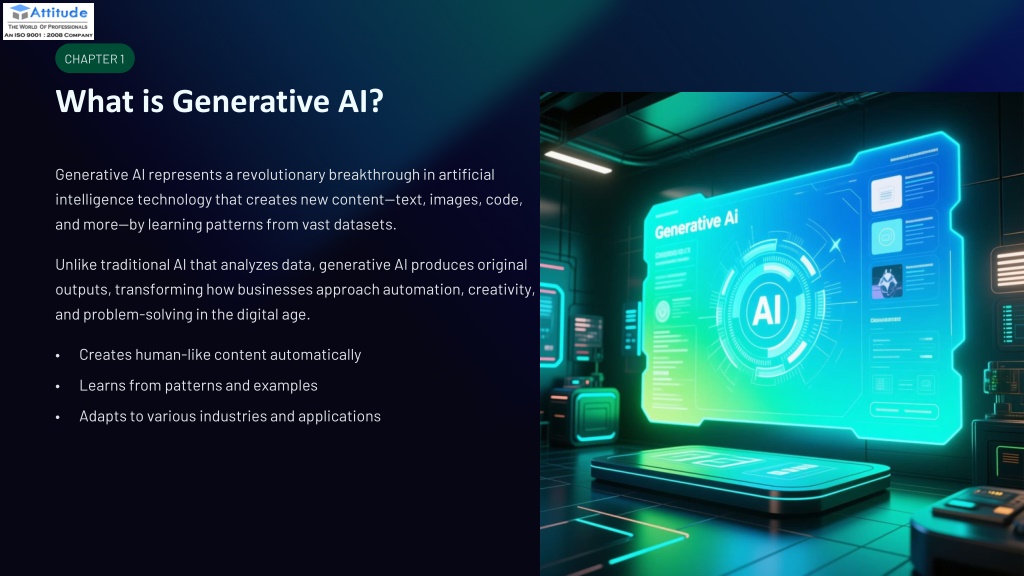 2. CHAPTER 1 What is Generative AI? Generative AI represents a revolutionary breakthrough in artificial intelligence technology that creates new content—text, images, code, and more—by learning patterns from vast datasets. Unlike traditional AI that analyzes data, generative AI produces original outputs, transforming how businesses approach automation, creativity, and problem-solving in the digital age. • Creates human-like content automatically • Learns from patterns and examples • Adapts to various industries and applications
