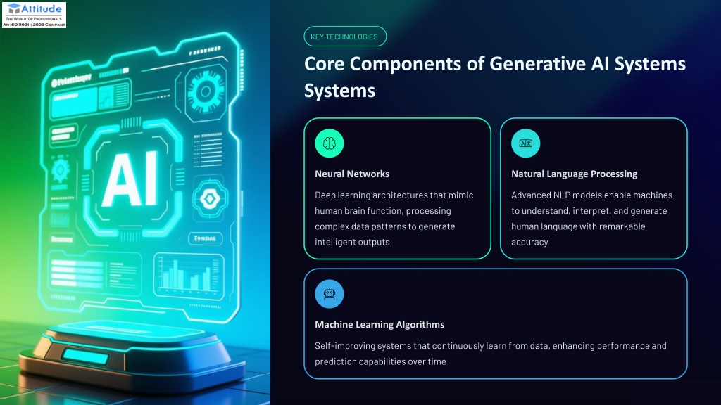 3. KEY TECHNOLOGIES Core Components of Generative AI Systems Neural Networks Natural Language Processing Deep learning architectures that mimic human brain function, processing complex data patterns to generate intelligent outputs Advanced NLP models enable machines to understand, interpret, and generate human language with remarkable accuracy Machine Learning Algorithms Self-improving systems that continuously learn from data, enhancing performance and prediction capabilities over time