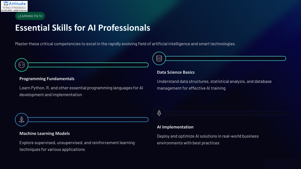 7. LEARNING PATH Essential Skills for AI Professionals Master these critical competencies to excel in the rapidly evolving field of artificial intelligence and smart technologies. Data Science Basics Programming Fundamentals Understand data structures, statistical analysis, and database management for effective AI training Learn Python, R, and other essential programming languages for AI development and implementation AI Implementation Machine Learning Models Deploy and optimize AI solutions in real-world business environments with best practices Explore supervised, unsupervised, and reinforcement learning techniques for various applications