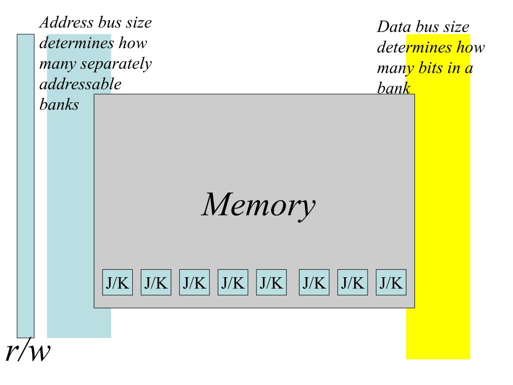 Address bus size determines how many separately addressable banks Data bus size determines how many bits in a bank Memory J/K J/K J/K J/K J/K J/K J/K J/K r/w