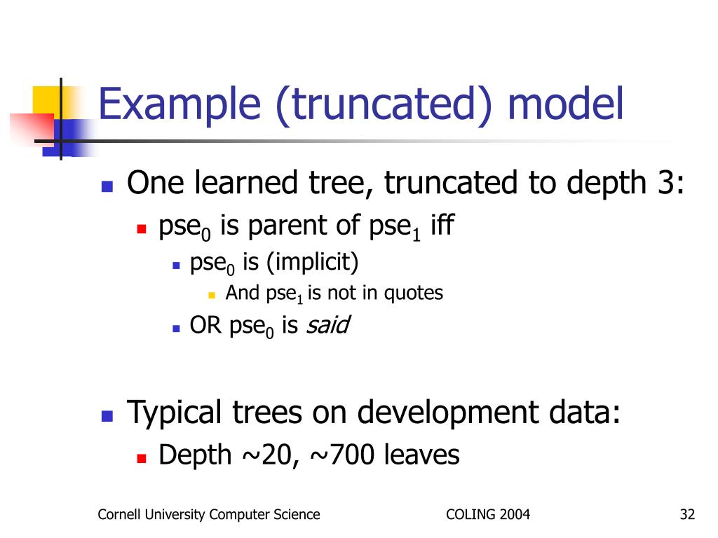Example (truncated) model • One learned tree, truncated to depth 3: • pse0 is parent of pse1 iff • pse0 is (implicit) • And pse1 is not in quotes • OR pse0 is said • Typical trees on development data: • Depth ~20, ~700 leaves Cornell University Computer Science COLING 2004