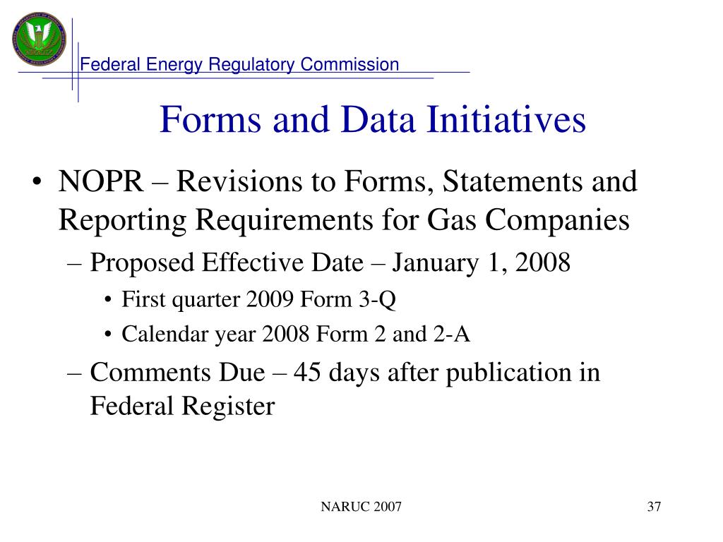 Forms and Data Initiatives • NOPR – Revisions to Forms, Statements and Reporting Requirements for Gas Companies • Proposed Effective Date – January 1, 2008 • First quarter 2009 Form 3-Q • Calendar year 2008 Form 2 and 2-A • Comments Due – 45 days after publication in Federal Register NARUC 2007