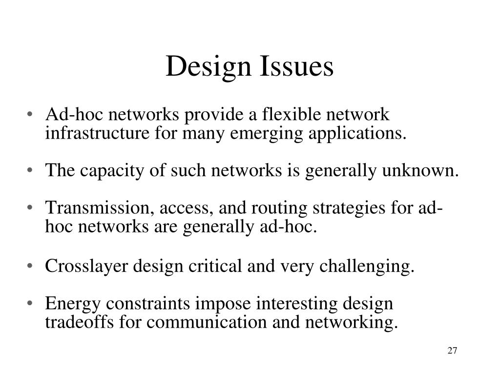 Design Issues • Ad-hoc networks provide a flexible network infrastructure for many emerging applications. • The capacity of such networks is generally unknown. • Transmission, access, and routing strategies for ad-hoc networks are generally ad-hoc. • Crosslayer design critical and very challenging. • Energy constraints impose interesting design tradeoffs for communication and networking.