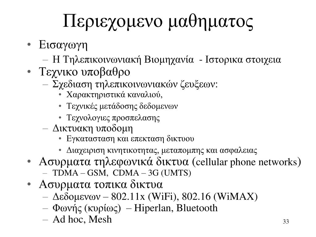 Περιεχομενο μαθηματος • Εισαγωγη • Η Τηλεπικοινωνιακή Βιομηχανία - Ιστορικα στοιχεια • Τεχνικο υποβαθρο • Σχεδιαση τηλεπικοινωνιακών ζευξεων: • Χαρακτηριστικά καναλιού, • Τεχνικές μετάδοσης δεδομενων • Τεχνολογιες προσπελασης • Δικτυακη υποδομη • Εγκατασταση και επεκταση δικτυου • Διαχειριση κινητικοτητας, μεταπομπης και ασφαλειας • Ασυρματα τηλεφωνικά δικτυα (cellular phone networks) • TDMA – GSM, CDMA – 3G (UMTS) • Ασυρματα τοπικα δικτυα • Δεδομενων – 802.11x (WiFi), 802.16 (WiMAX) • Φωνής (κυρίως) – Hiperlan, Bluetooth • Ad hoc, Mesh