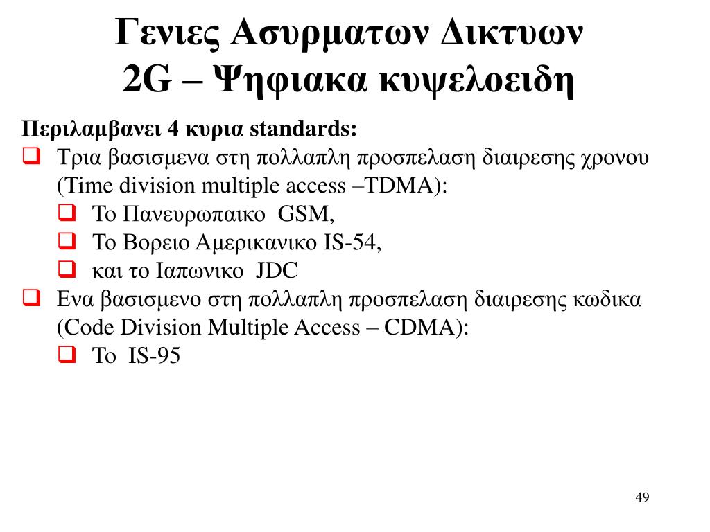 Γενιες Ασυρματων Δικτυων2G – Ψηφιακα κυψελοειδη Περιλαμβανει 4 κυρια standards: • Τρια βασισμενα στη πολλαπλη προσπελαση διαιρεσης χρονου (Time division multiple access –TDMA): • To Πανευρωπαικο GSM, • Το Βορειο Αμερικανικο IS-54, • και το Ιαπωνικο JDC • Ενα βασισμενο στη πολλαπλη προσπελαση διαιρεσης κωδικα (Code Division Multiple Access – CDMA): • To IS-95