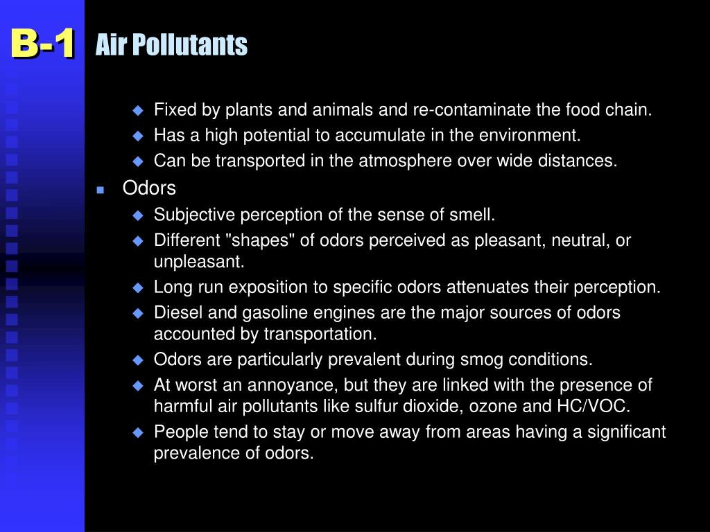 Air Pollutants B-1 • Fixed by plants and animals and re-contaminate the food chain. • Has a high potential to accumulate in the environment. • Can be transported in the atmosphere over wide distances. • Odors • Subjective perception of the sense of smell. • Different "shapes" of odors perceived as pleasant, neutral, or unpleasant. • Long run exposition to specific odors attenuates their perception. • Diesel and gasoline engines are the major sources of odors accounted by transportation. • Odors are particularly prevalent during smog conditions. • At worst an annoyance, but they are linked with the presence of harmful air pollutants like sulfur dioxide, ozone and HC/VOC. • People tend to stay or move away from areas having a significant prevalence of odors.