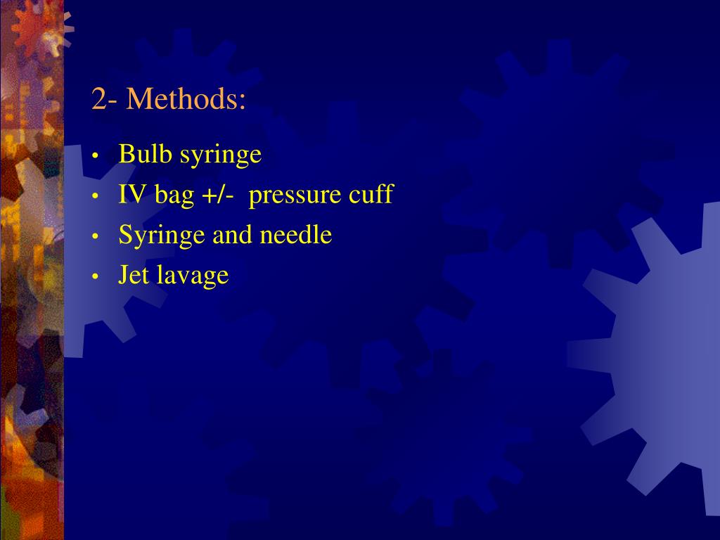 2- Methods: • Bulb syringe • IV bag +/- pressure cuff • Syringe and needle • Jet lavage