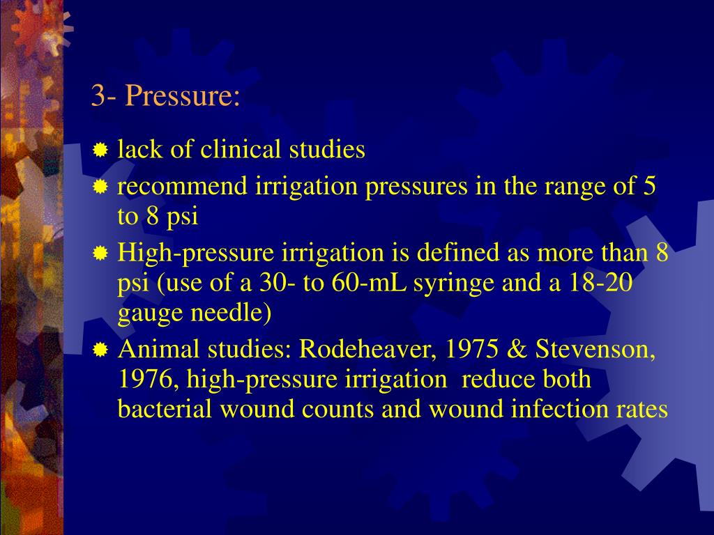 3- Pressure: • lack of clinical studies • recommend irrigation pressures in the range of 5 to 8 psi • High-pressure irrigation is defined as more than 8 psi (use of a 30- to 60-mL syringe and a 18-20 gauge needle) • Animal studies: Rodeheaver, 1975 & Stevenson, 1976, high-pressure irrigation reduce both bacterial wound counts and wound infection rates