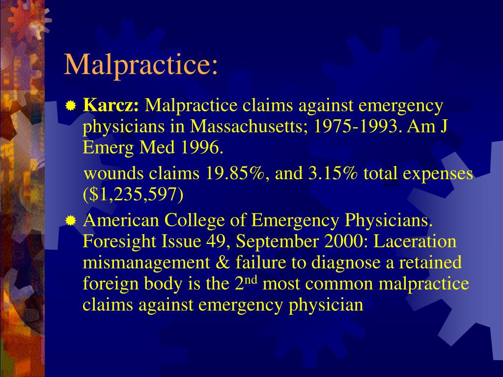 Malpractice: • Karcz: Malpractice claims against emergency physicians in Massachusetts; 1975-1993. Am J Emerg Med 1996. wounds claims 19.85%, and 3.15% total expenses ($1,235,597) • American College of Emergency Physicians. Foresight Issue 49, September 2000: Laceration mismanagement & failure to diagnose a retained foreign body is the 2nd most common malpractice claims against emergency physician