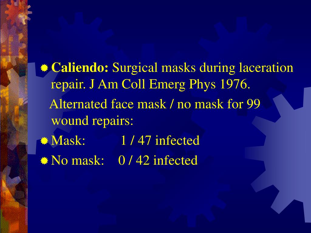 Caliendo: Surgical masks during laceration repair. J Am Coll Emerg Phys 1976. Alternated face mask / no mask for 99 wound repairs: • Mask: 1 / 47 infected • No mask: 0 / 42 infected