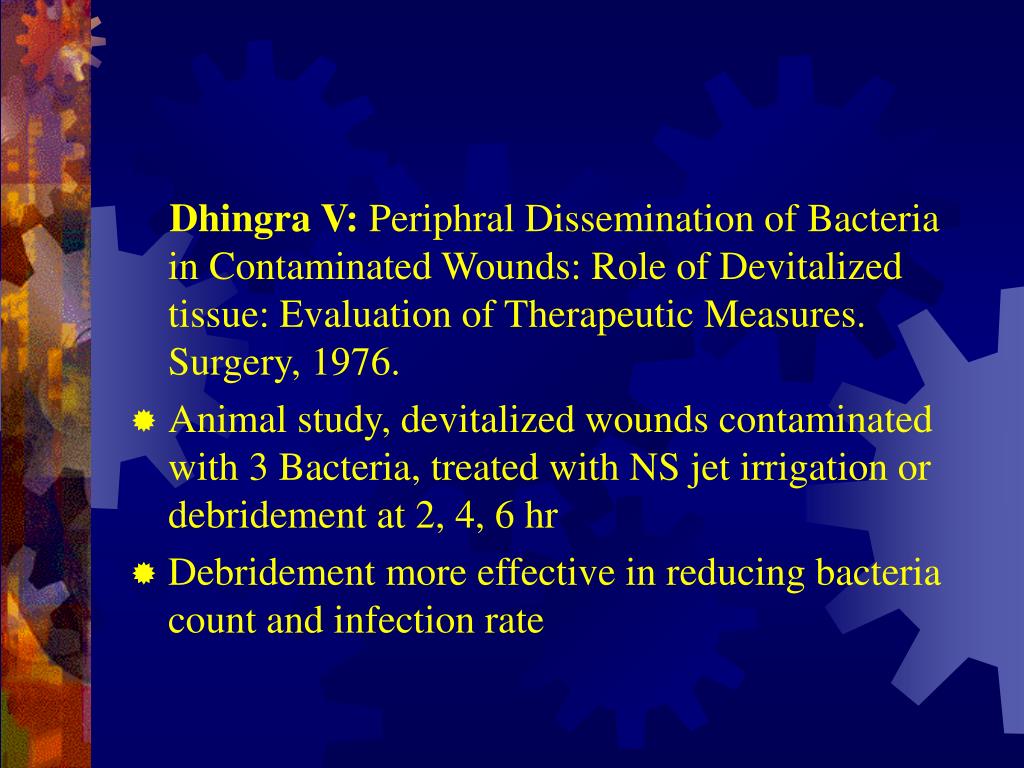 Dhingra V: Periphral Dissemination of Bacteria in Contaminated Wounds: Role of Devitalized tissue: Evaluation of Therapeutic Measures. Surgery, 1976. • Animal study, devitalized wounds contaminated with 3 Bacteria, treated with NS jet irrigation or debridement at 2, 4, 6 hr • Debridement more effective in reducing bacteria count and infection rate
