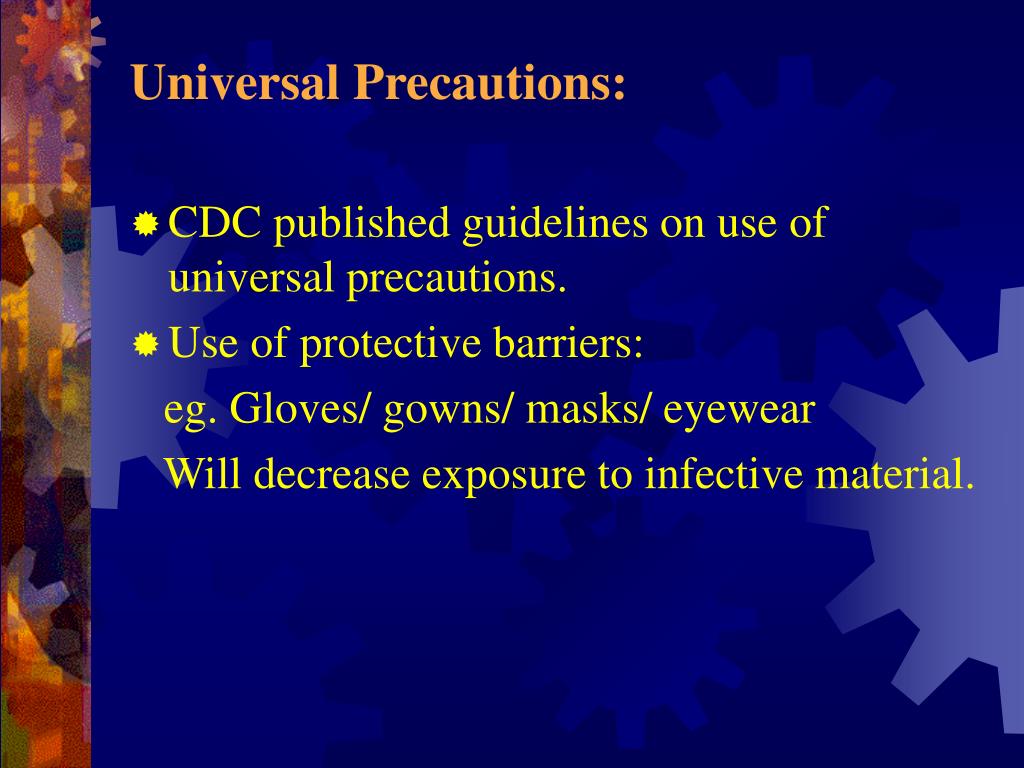 Universal Precautions: • CDC published guidelines on use of universal precautions. • Use of protective barriers: eg. Gloves/ gowns/ masks/ eyewear Will decrease exposure to infective material.
