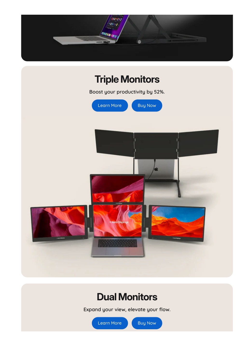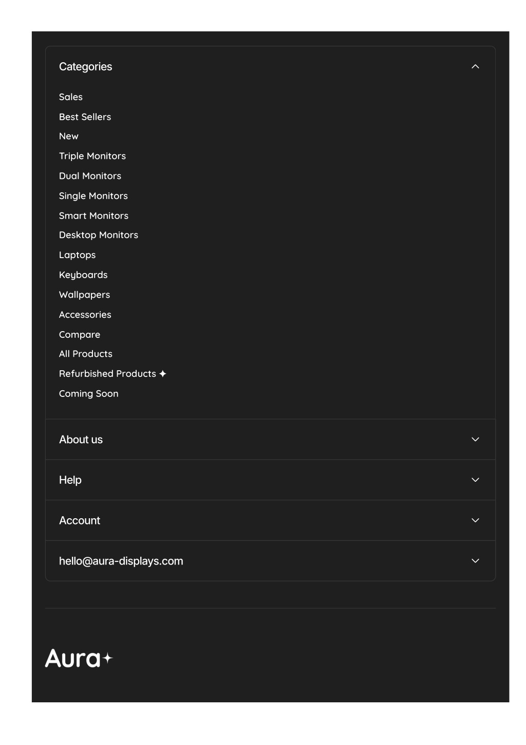 Categories Sales ? Best Sellers New Triple Monitors Dual Monitors Single Monitors Smart Monitors Desktop Monitors Laptops Keyboards Wallpapers Accessories Compare ? All Products Refurbished Products ✦ Coming Soon ⏳ Aboutus Help Account hello@aura-displays.com
