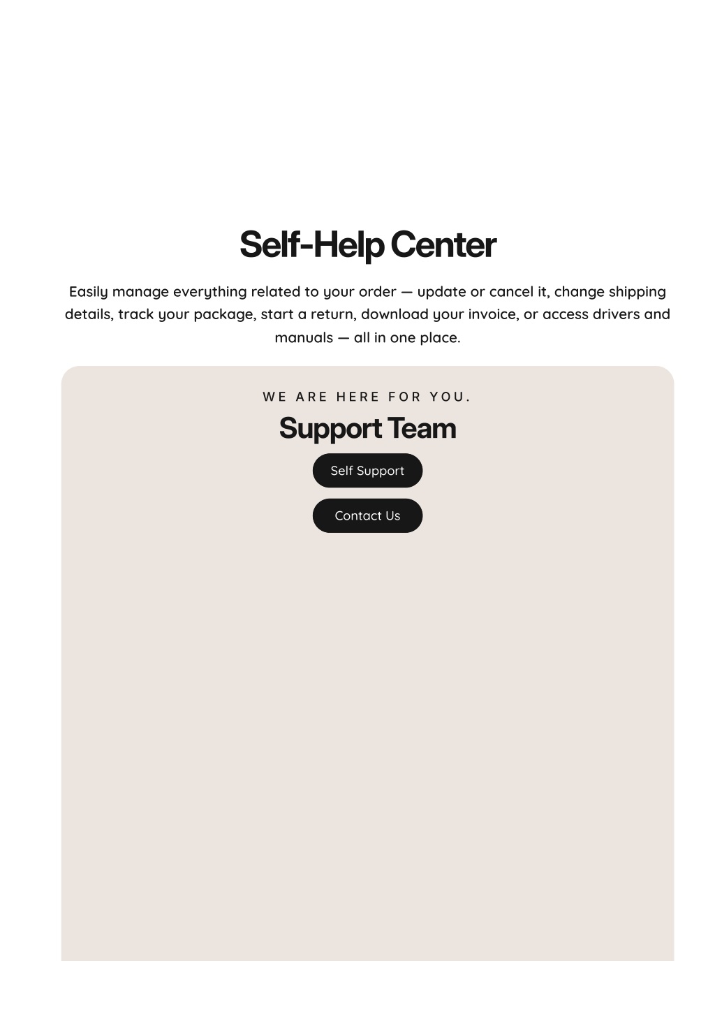 Self- Help Center Easily manage everything related to your order — update or cancel it, change shipping details, track your package, start a return, download your invoice, or access drivers and manuals — all in one place. W EA R EH E R EF O RY O U . SupportTeam Self Support Contact Us