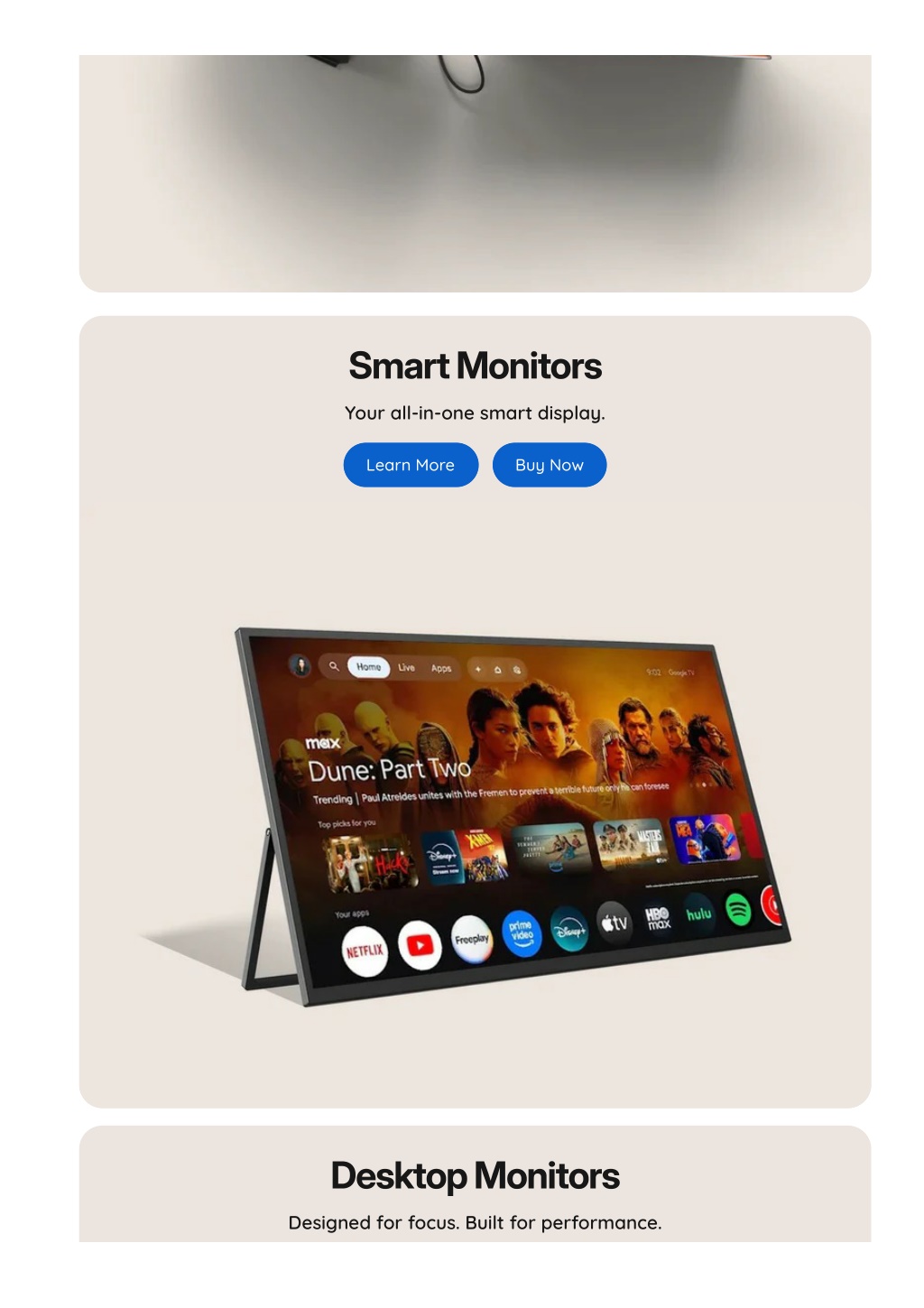 SmartMonitors Your all-in-one smart display. Learn More Buy Now DesktopMonitors Designed for focus. Built for performance.