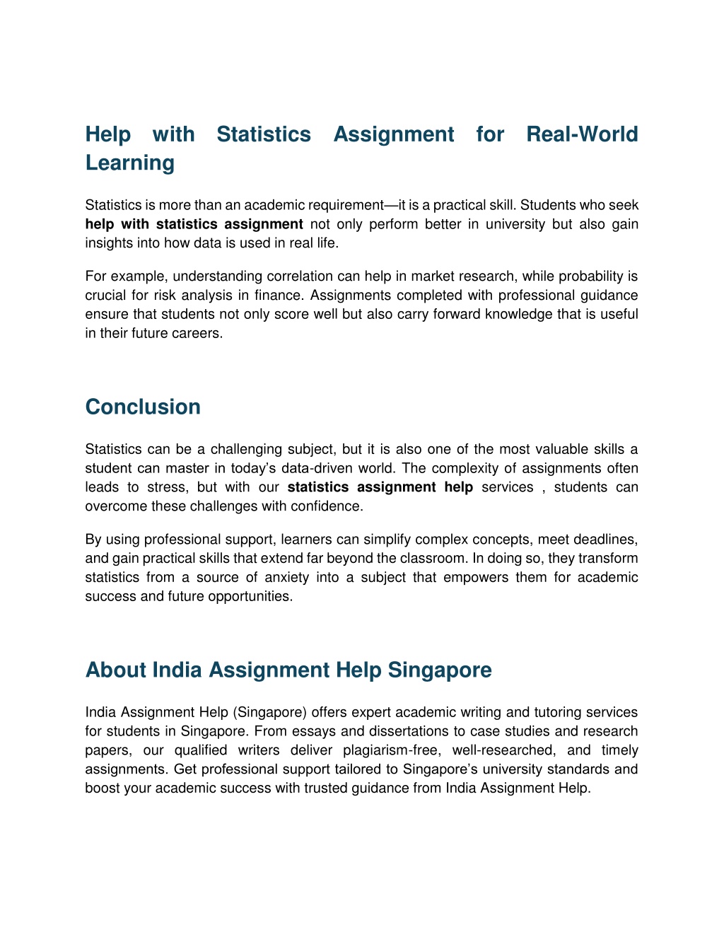 Help with Statistics Assignment for Real-World Learning Statistics is more than an academic requirement—it is a practical skill. Students who seek help with statistics assignment not only perform better in university but also gain insights into how data is used in real life. For example, understanding correlation can help in market research, while probability is crucial for risk analysis in finance. Assignments completed with professional guidance ensure that students not only score well but also carry forward knowledge that is useful in their future careers. Conclusion Statistics can be a challenging subject, but it is also one of the most valuable skills a student can master in today’s data-driven world. The complexity of assignments often leads to stress, but with our statistics assignment help services , students can overcome these challenges with confidence. By using professional support, learners can simplify complex concepts, meet deadlines, and gain practical skills that extend far beyond the classroom. In doing so, they transform statistics from a source of anxiety into a subject that empowers them for academic success and future opportunities. About India Assignment Help Singapore India Assignment Help (Singapore) offers expert academic writing and tutoring services for students in Singapore. From essays and dissertations to case studies and research papers, our qualified writers deliver plagiarism-free, well-researched, and timely assignments. Get professional support tailored to Singapore’s university standards and boost your academic success with trusted guidance from India Assignment Help.