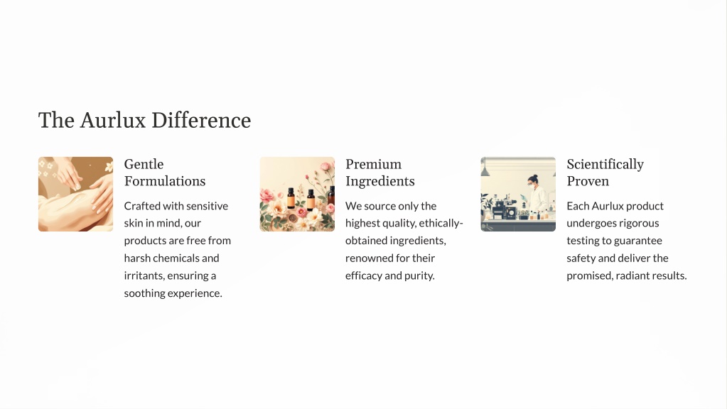 The Aurlux Difference Gentle Formulations Premium Ingredients Scientifically Proven Crafted with sensitive skin in mind, our products are free from harsh chemicals and irritants, ensuring a soothing experience. We source only the highest quality, ethically- obtained ingredients, renowned for their efficacy and purity. Each Aurlux product undergoes rigorous testing to guarantee safety and deliver the promised, radiant results.
