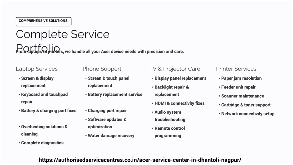 COMPREHENSIVE SOLUTIONS Complete Service Portfolio From laptops to printers, we handle all your Acer device needs with precision and care. Laptop Services Phone Support TV & Projector Care Printer Services • Screen & display replacement • Screen & touch panel replacement • Display panel replacement • Paper jam resolution • Backlight repair & replacement • Feeder unit repair • Keyboard and touchpad repair • Battery replacement service • Scanner maintenance • HDMI & connectivity fixes • Cartridge & toner support • Battery & charging port fixes • Charging port repair • Audio system troubleshooting • Network connectivity setup • Software updates & optimization • Overheating solutions & cleaning • Remote control programming • Water damage recovery • Complete diagnostics https://authorisedservicecentres.co.in/acer-service-center-in-dhantoli-nagpur/