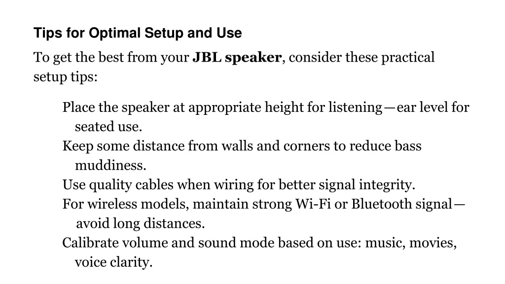 7. Tips for Optimal Setup and Use To get the best from your JBL speaker, consider these practical setup tips: Place the speaker at appropriate height for listening — ear level for seated use. Keep some distance from walls and corners to reduce bass muddiness. Use quality cables when wiring for better signal integrity. For wireless models, maintain strong Wi-Fi or Bluetooth signal — avoid long distances. Calibrate volume and sound mode based on use: music, movies, voice clarity.