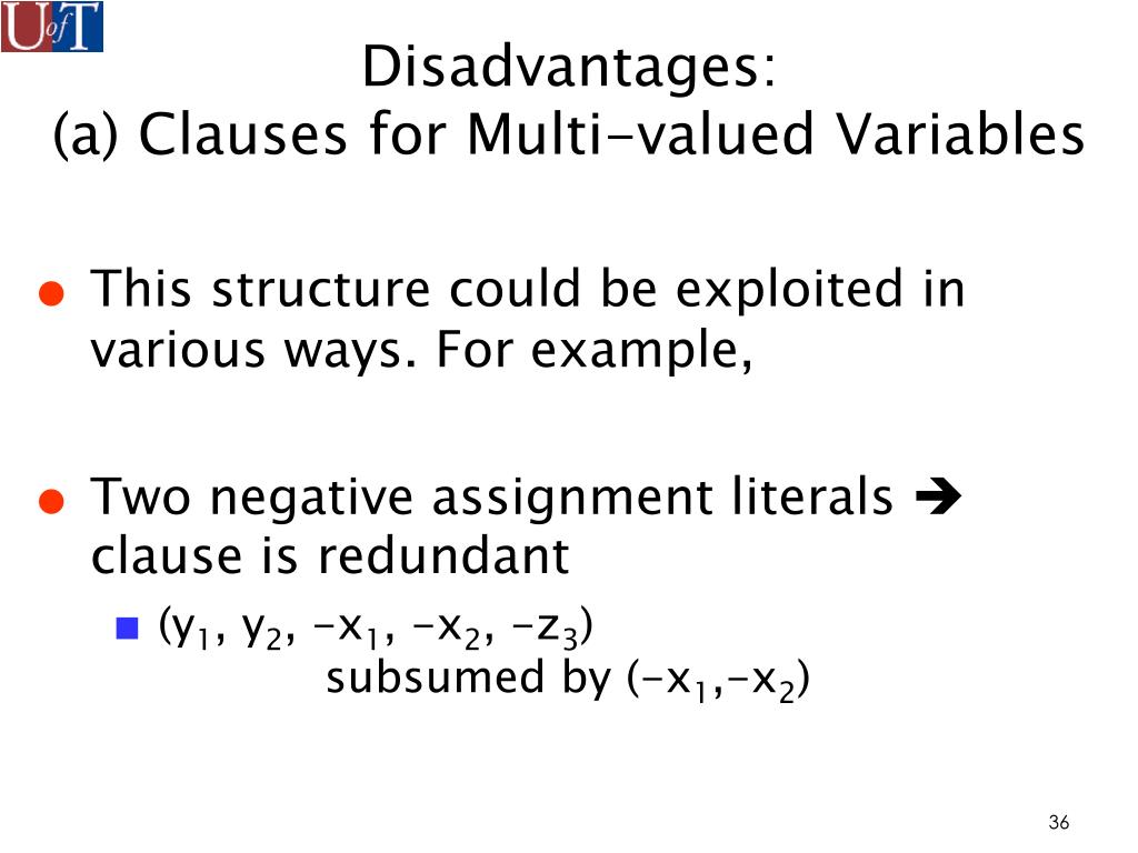 Disadvantages:(a) Clauses for Multi-valued Variables • This structure could be exploited in various ways. For example, • Two negative assignment literals clause is redundant • (y1, y2, -x1, -x2, -z3) subsumed by (-x1,-x2)