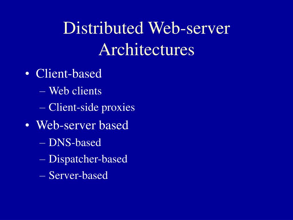 Distributed Web-server Architectures • Client-based • Web clients • Client-side proxies • Web-server based • DNS-based • Dispatcher-based • Server-based