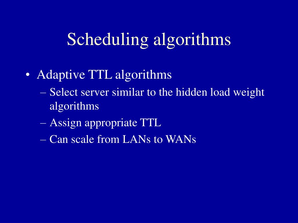 Scheduling algorithms • Adaptive TTL algorithms • Select server similar to the hidden load weight algorithms • Assign appropriate TTL • Can scale from LANs to WANs