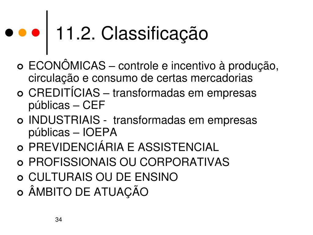 11.2. Classificação • ECONÔMICAS – controle e incentivo à produção, circulação e consumo de certas mercadorias • CREDITÍCIAS – transformadas em empresas públicas – CEF • INDUSTRIAIS - transformadas em empresas públicas – IOEPA • PREVIDENCIÁRIA E ASSISTENCIAL • PROFISSIONAIS OU CORPORATIVAS • CULTURAIS OU DE ENSINO • ÂMBITO DE ATUAÇÃO