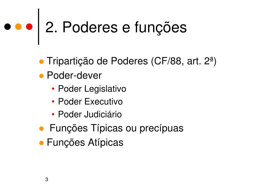 2. Poderes e funções • Tripartição de Poderes (CF/88, art. 2ª) • Poder-dever • Poder Legislativo • Poder Executivo • Poder Judiciário • Funções Típicas ou precípuas • Funções Atípicas