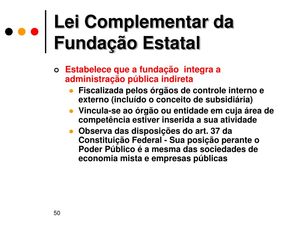 Lei Complementar da Fundação Estatal • Estabelece que a fundação integra a administração públicaindireta • Fiscalizada pelos órgãos de controle interno e externo (incluído o conceito de subsidiária) • Vincula-se ao órgão ou entidade em cuja área de competência estiver inserida a sua atividade • Observa das disposições do art. 37 da Constituição Federal - Sua posição perante o Poder Público é a mesma das sociedades de economia mista e empresas públicas