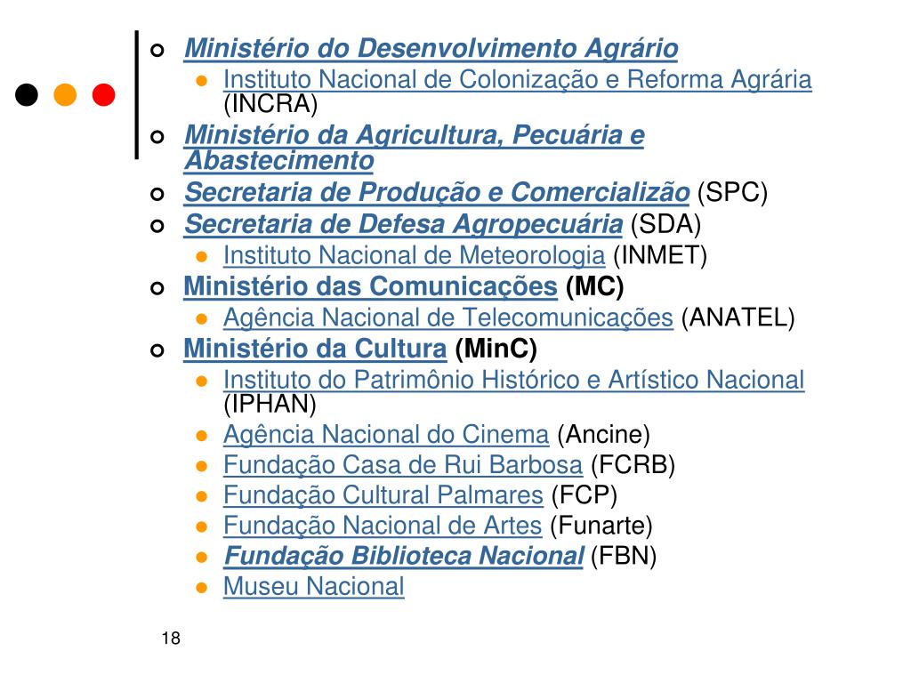 Ministério do Desenvolvimento Agrário Instituto Nacional de Colonização e Reforma Agrária (INCRA) Ministério da Agricultura, Pecuária e Abastecimento Secretaria de Produção e Comercializão (SPC) Secretaria de Defesa Agropecuária (SDA) Instituto Nacional de Meteorologia (INMET) Ministério das Comunicações (MC) Agência Nacional de Telecomunicações (ANATEL) Ministério da Cultura (MinC) Instituto do Patrimônio Histórico e Artístico Nacional (IPHAN) Agência Nacional do Cinema (Ancine) Fundação Casa de Rui Barbosa (FCRB) Fundação Cultural Palmares (FCP) Fundação Nacional de Artes (Funarte) Fundação Biblioteca Nacional (FBN) Museu Nacional