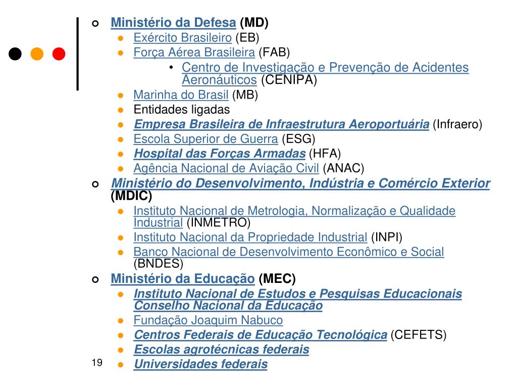 Ministério da Defesa (MD) • Exército Brasileiro (EB) • Força Aérea Brasileira (FAB) • Centro de Investigação e Prevenção de Acidentes Aeronáuticos (CENIPA) • Marinha do Brasil (MB) • Entidades ligadas • Empresa Brasileira de Infraestrutura Aeroportuária (Infraero) • Escola Superior de Guerra (ESG) • Hospital das Forças Armadas (HFA) • Agência Nacional de Aviação Civil (ANAC) • Ministério do Desenvolvimento, Indústria e Comércio Exterior (MDIC) • Instituto Nacional de Metrologia, Normalização e Qualidade Industrial (INMETRO) • Instituto Nacional da Propriedade Industrial (INPI) • Banco Nacional de Desenvolvimento Econômico e Social (BNDES) • Ministério da Educação (MEC) • Instituto Nacional de Estudos e Pesquisas EducacionaisConselho Nacional da Educação • Fundação Joaquim Nabuco • Centros Federais de Educação Tecnológica (CEFETS) • Escolas agrotécnicas federais • Universidades federais
