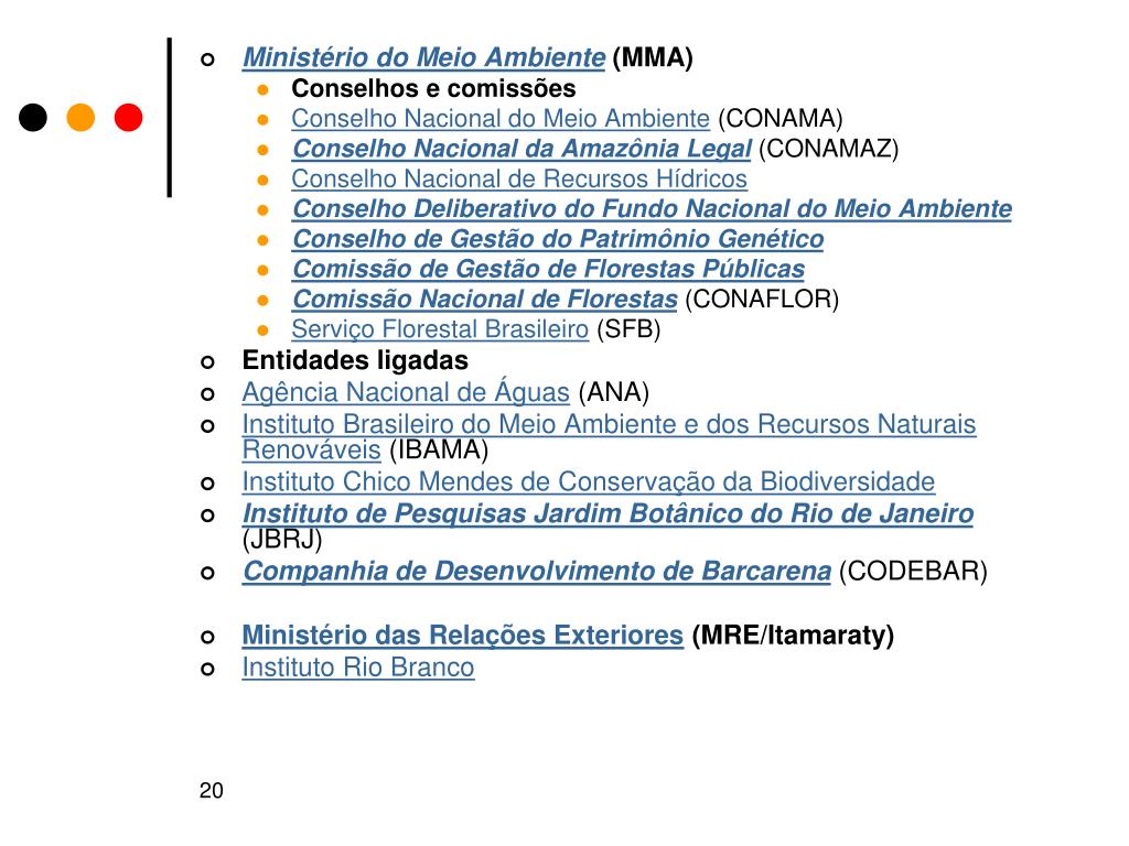 Ministério do Meio Ambiente (MMA) • Conselhos e comissões • Conselho Nacional do Meio Ambiente (CONAMA) • Conselho Nacional da Amazônia Legal (CONAMAZ) • Conselho Nacional de Recursos Hídricos • Conselho Deliberativo do Fundo Nacional do Meio Ambiente • Conselho de Gestão do Patrimônio Genético • Comissão de Gestão de Florestas Públicas • Comissão Nacional de Florestas (CONAFLOR) • Serviço Florestal Brasileiro (SFB) • Entidades ligadas • Agência Nacional de Águas (ANA) • Instituto Brasileiro do Meio Ambiente e dos Recursos Naturais Renováveis (IBAMA) • Instituto Chico Mendes de Conservação da Biodiversidade • Instituto de Pesquisas Jardim Botânico do Rio de Janeiro (JBRJ) • Companhia de Desenvolvimento de Barcarena (CODEBAR) • Ministério das Relações Exteriores (MRE/Itamaraty) • Instituto Rio Branco