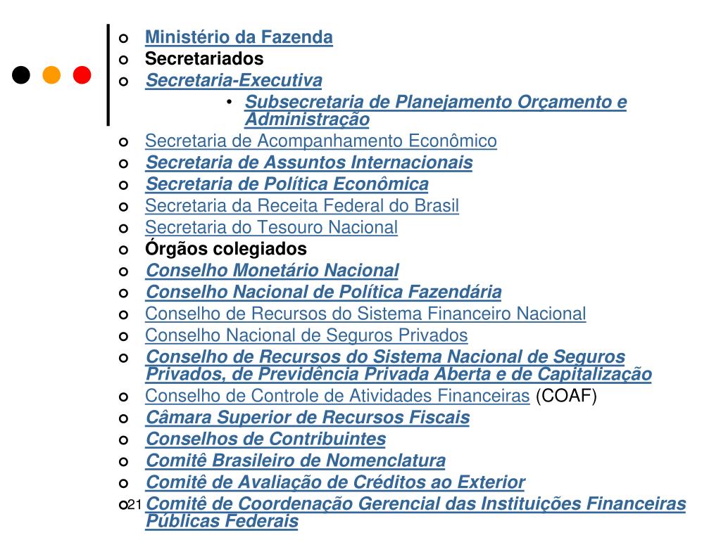 Ministério da Fazenda • Secretariados • Secretaria-Executiva • Subsecretaria de Planejamento Orçamento e Administração • Secretaria de Acompanhamento Econômico • Secretaria de Assuntos Internacionais • Secretaria de Política Econômica • Secretaria da Receita Federal do Brasil • Secretaria do Tesouro Nacional • Órgãos colegiados • Conselho Monetário Nacional • Conselho Nacional de Política Fazendária • Conselho de Recursos do Sistema Financeiro Nacional • Conselho Nacional de Seguros Privados • Conselho de Recursos do Sistema Nacional de Seguros Privados, de Previdência Privada Aberta e de Capitalização • Conselho de Controle de Atividades Financeiras (COAF) • Câmara Superior de Recursos Fiscais • Conselhos de Contribuintes • Comitê Brasileiro de Nomenclatura • Comitê de Avaliação de Créditos ao Exterior • Comitê de Coordenação Gerencial das Instituições Financeiras Públicas Federais