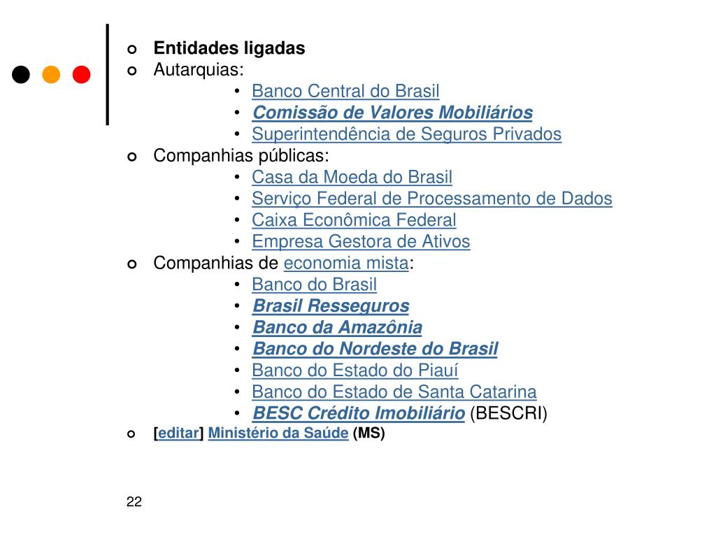 Entidades ligadas • Autarquias: • Banco Central do Brasil • Comissão de Valores Mobiliários • Superintendência de Seguros Privados • Companhias públicas: • Casa da Moeda do Brasil • Serviço Federal de Processamento de Dados • Caixa Econômica Federal • Empresa Gestora de Ativos • Companhias de economia mista: • Banco do Brasil • Brasil Resseguros • Banco da Amazônia • Banco do Nordeste do Brasil • Banco do Estado do Piauí • Banco do Estado de Santa Catarina • BESC Crédito Imobiliário (BESCRI) • [editar] Ministério da Saúde (MS)